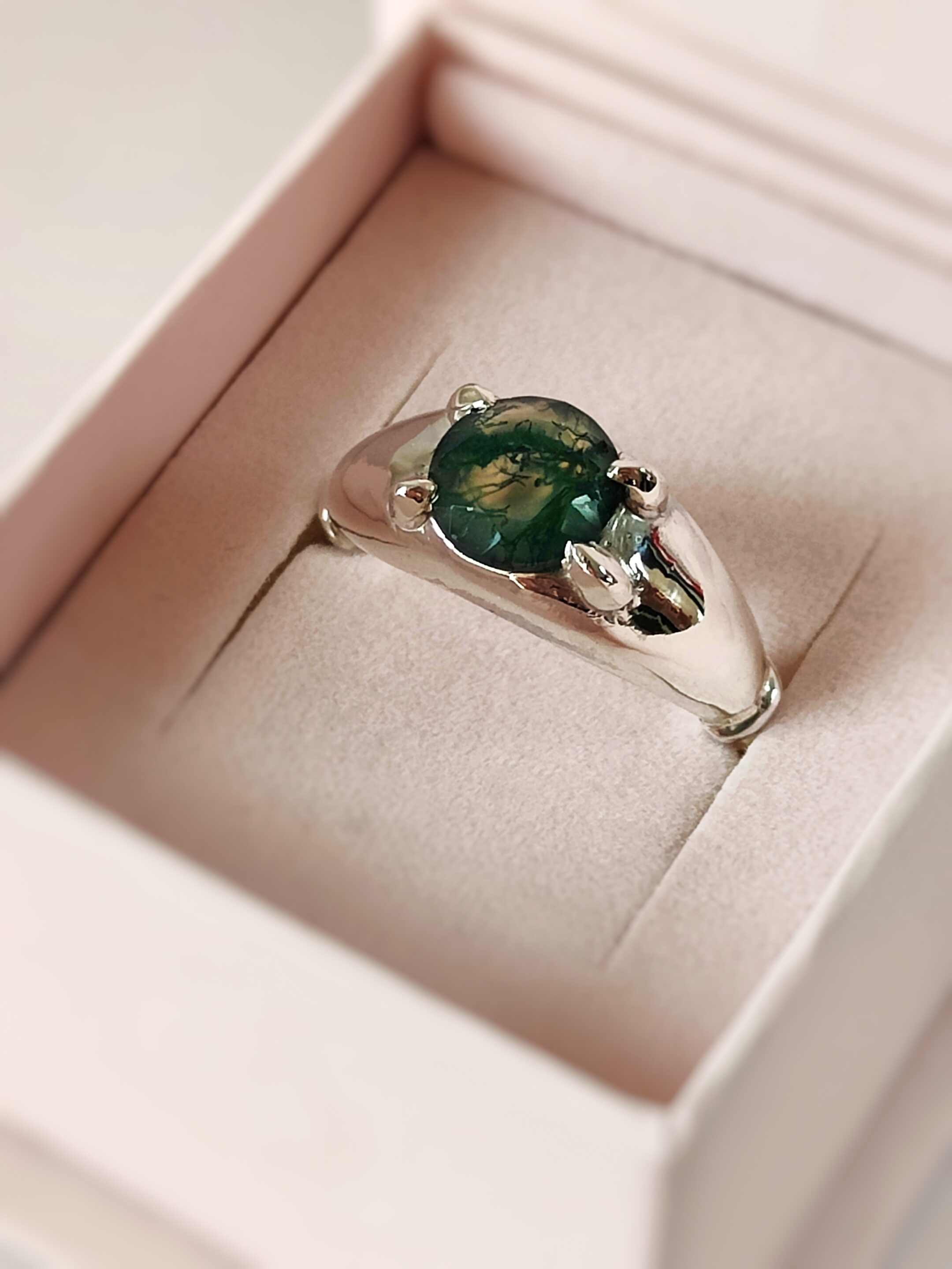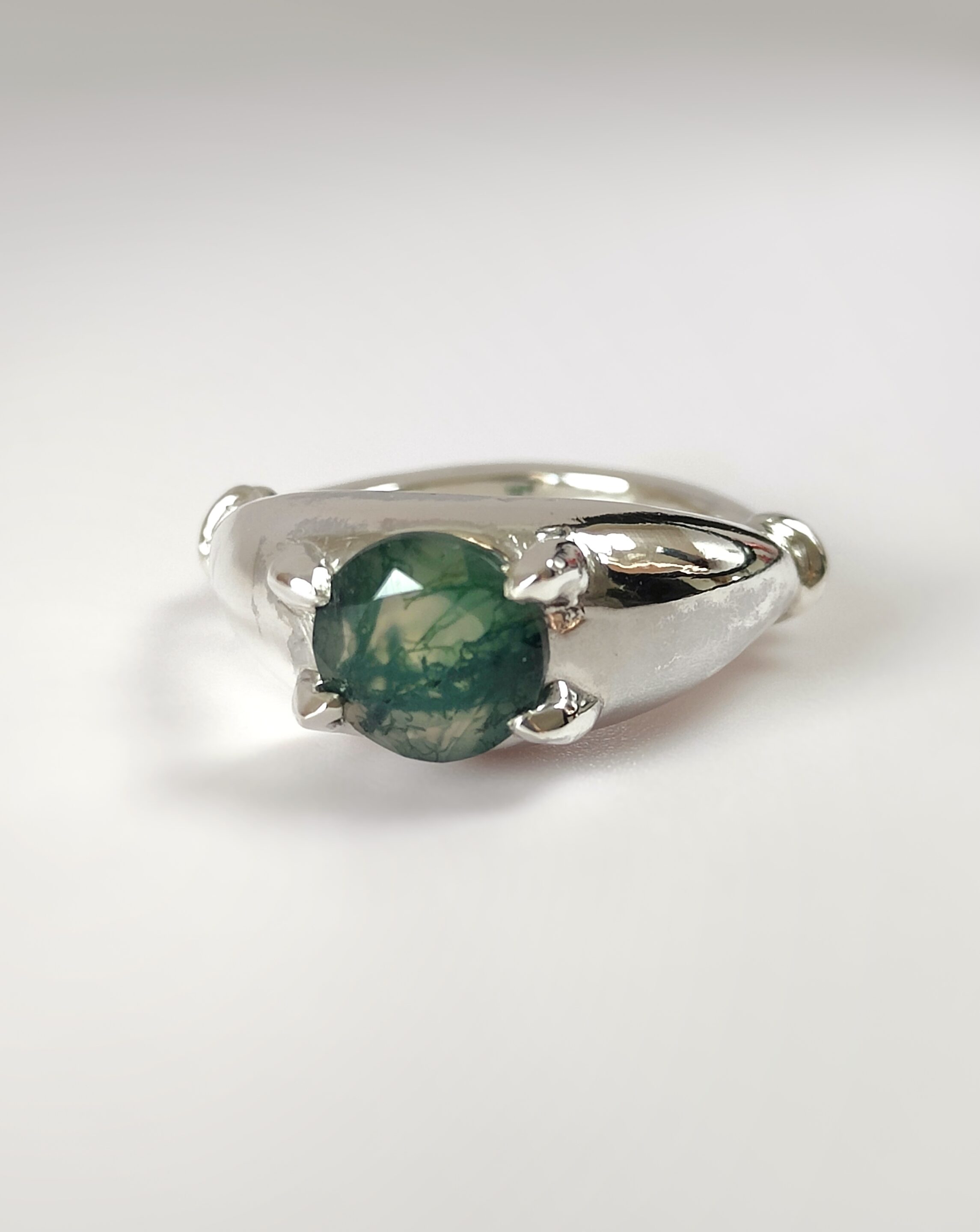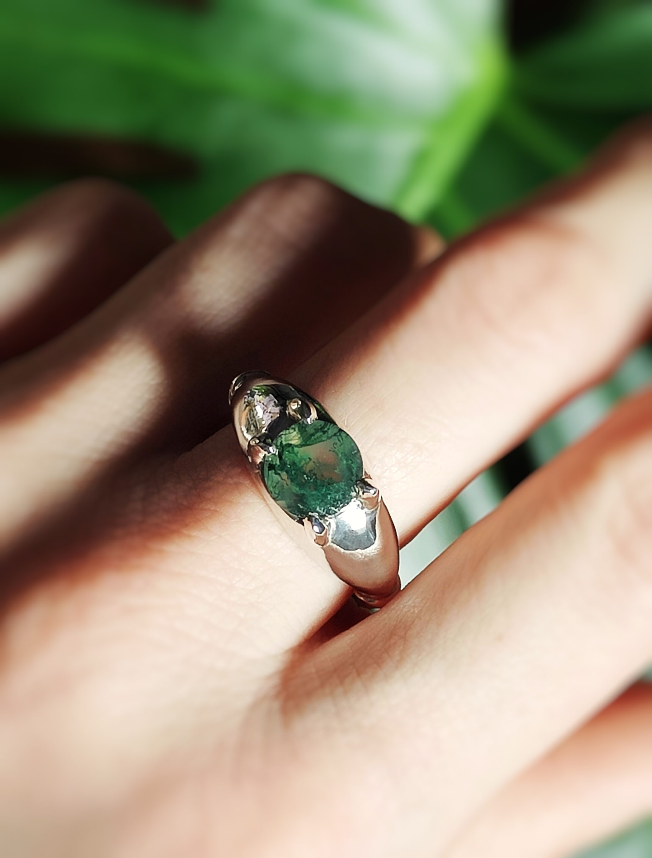 Sa monture épaisse et épurée met en valeur une agate mousse sertie sur le dessus, dont les inclusions naturelles évoquent un paysage forestier comme une fenêtre ouverte sur la nature.