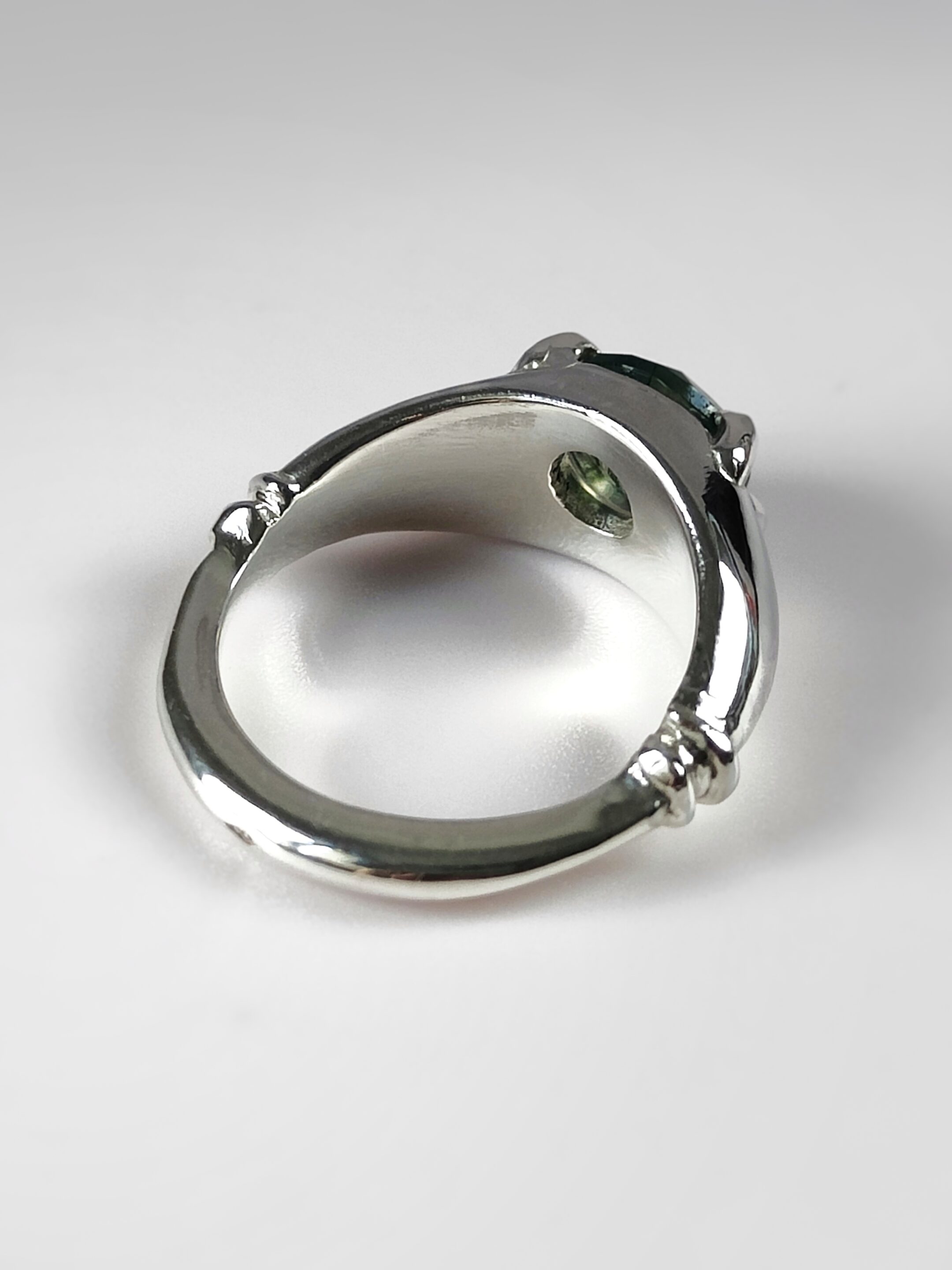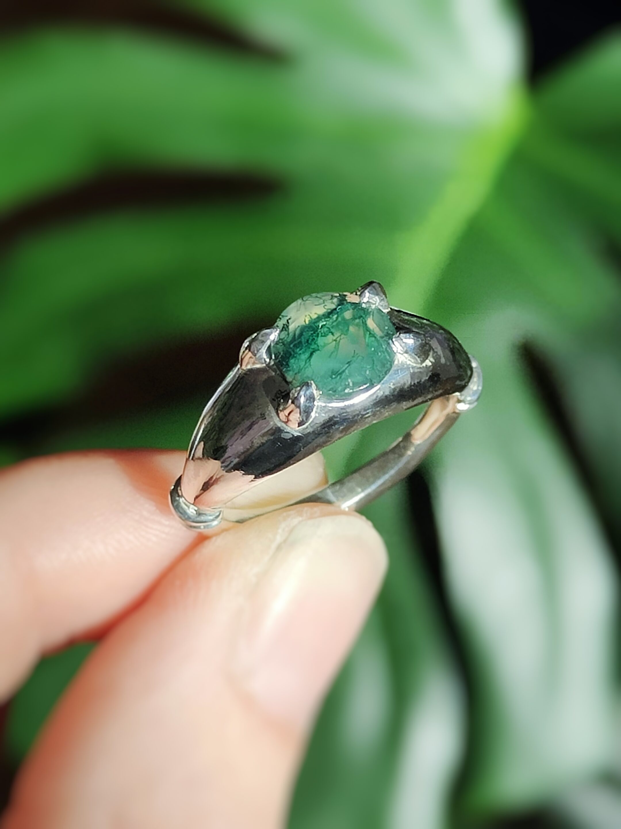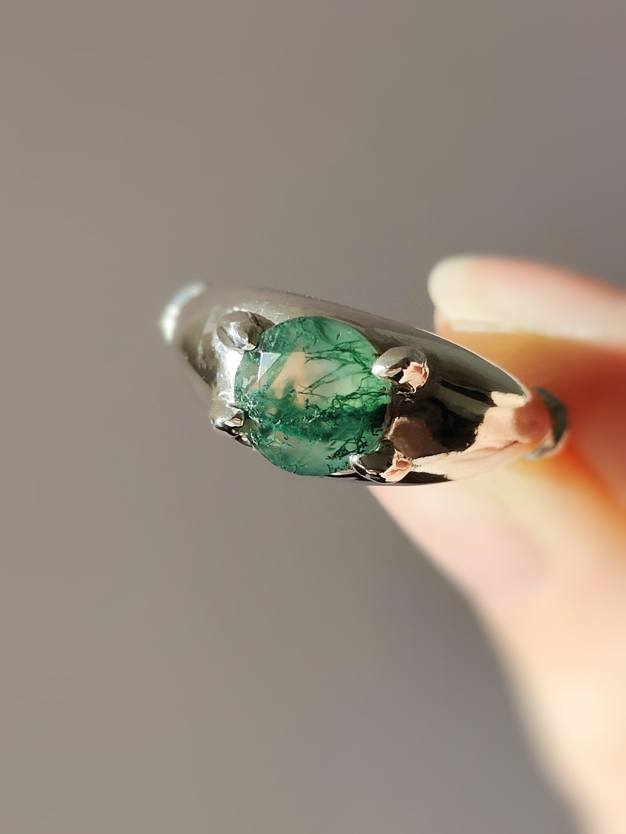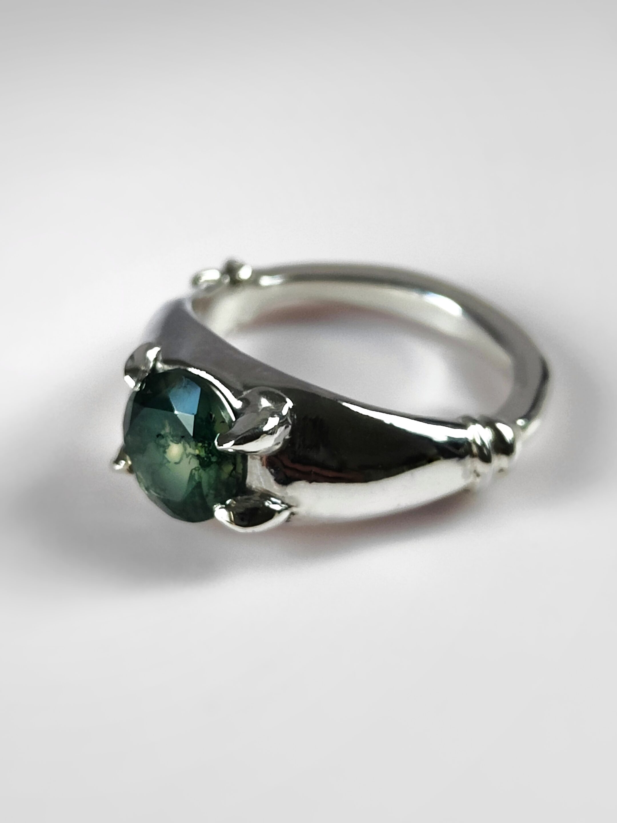 Sa monture épaisse et épurée met en valeur une agate mousse sertie sur le dessus, dont les inclusions naturelles évoquent un paysage forestier comme une fenêtre ouverte sur la nature.