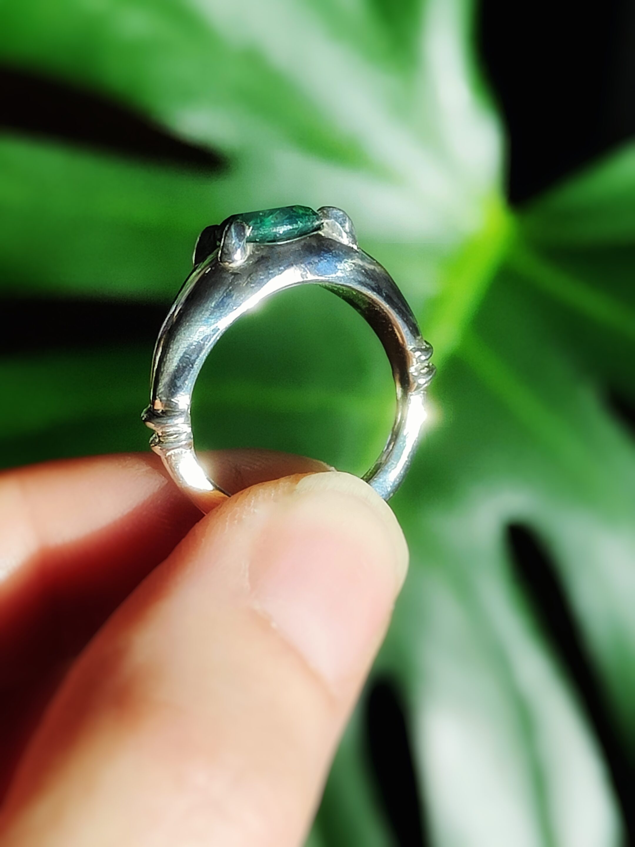 Une bague comme un fragment de forêt figé dans l’argent, précieuse par sa matière autant que par le geste qui l’a façonnée.