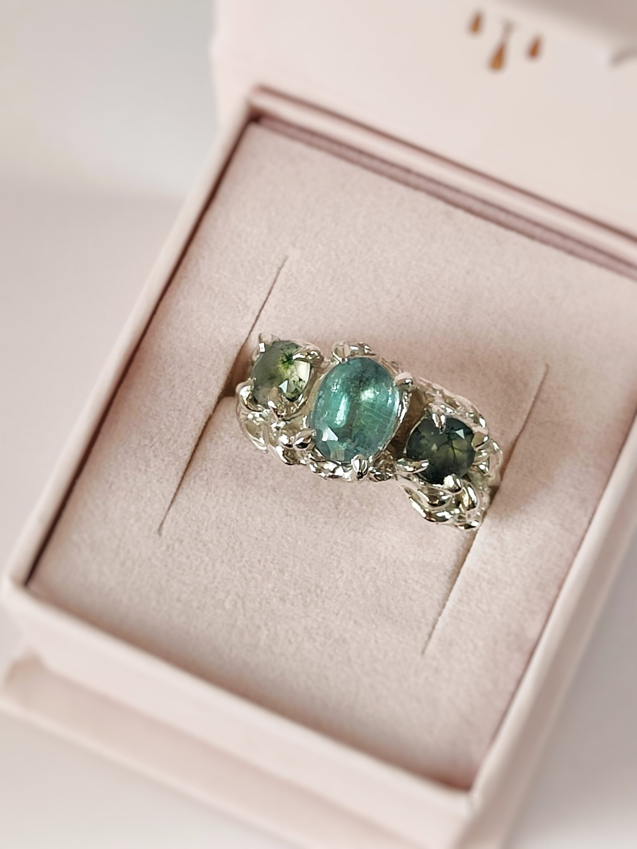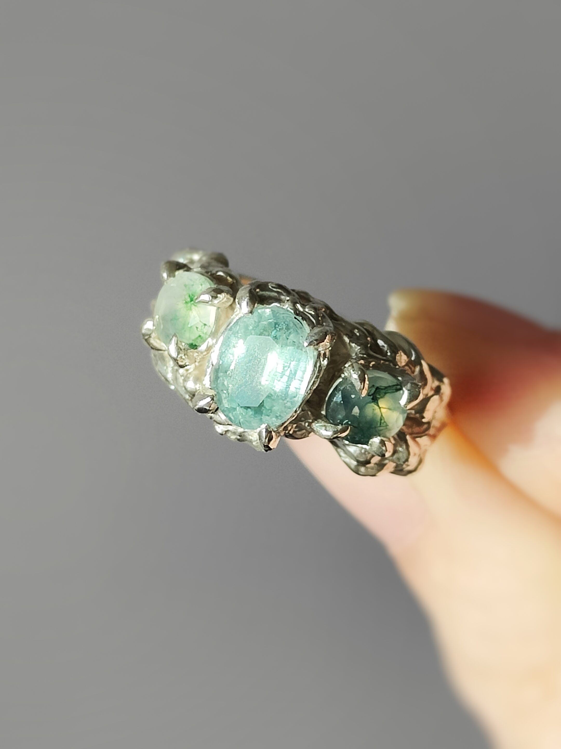 Bague organique en argent massif avec pierre Cyanite & Agate mousse