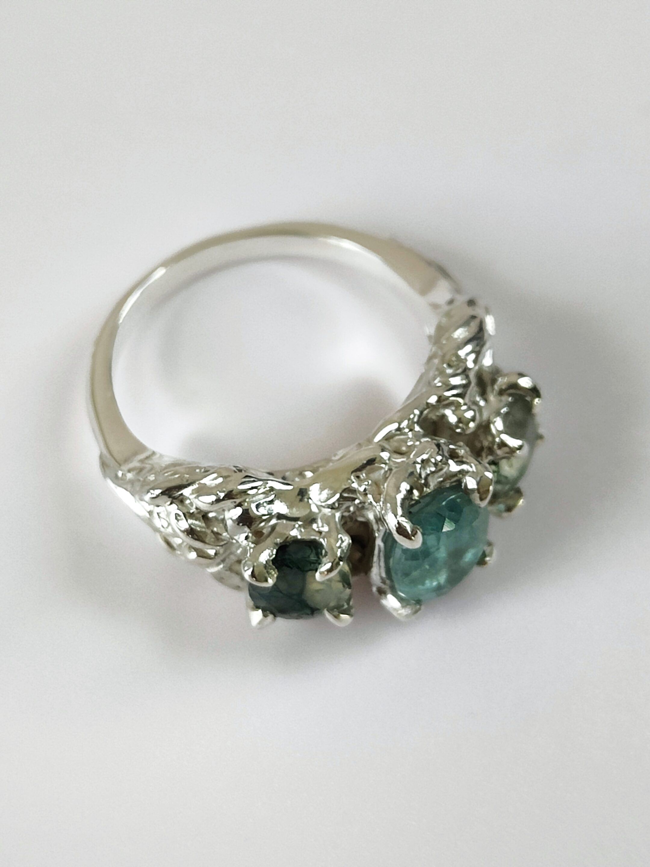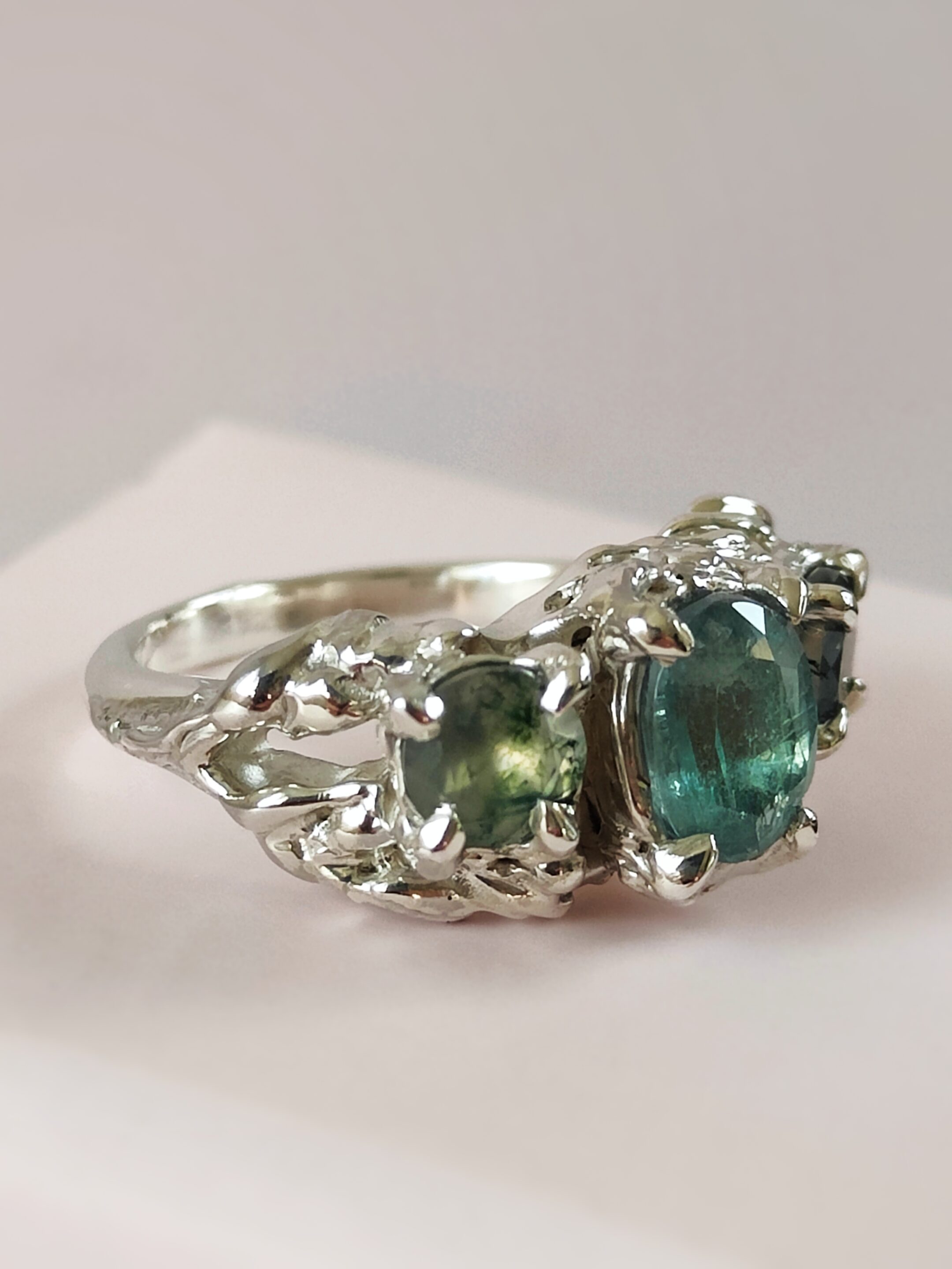 La monture, entièrement façonnée à la main, révèle une structure végétale entrelacée : vue de profil, l’argent semble se transformer en rameaux précieux qui s’enroulent et s’élèvent pour rejoindre les pierres.