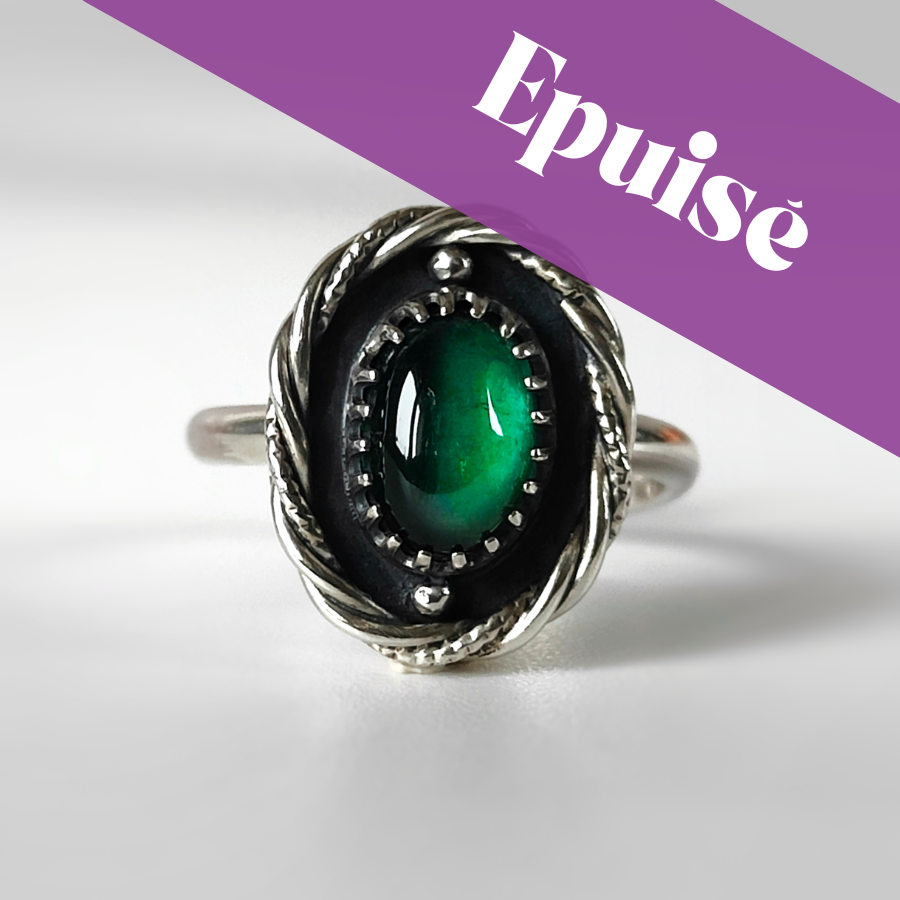Cette bague en argent massif allie contraste et lumière grâce a sa superbe Tourmaline verte.